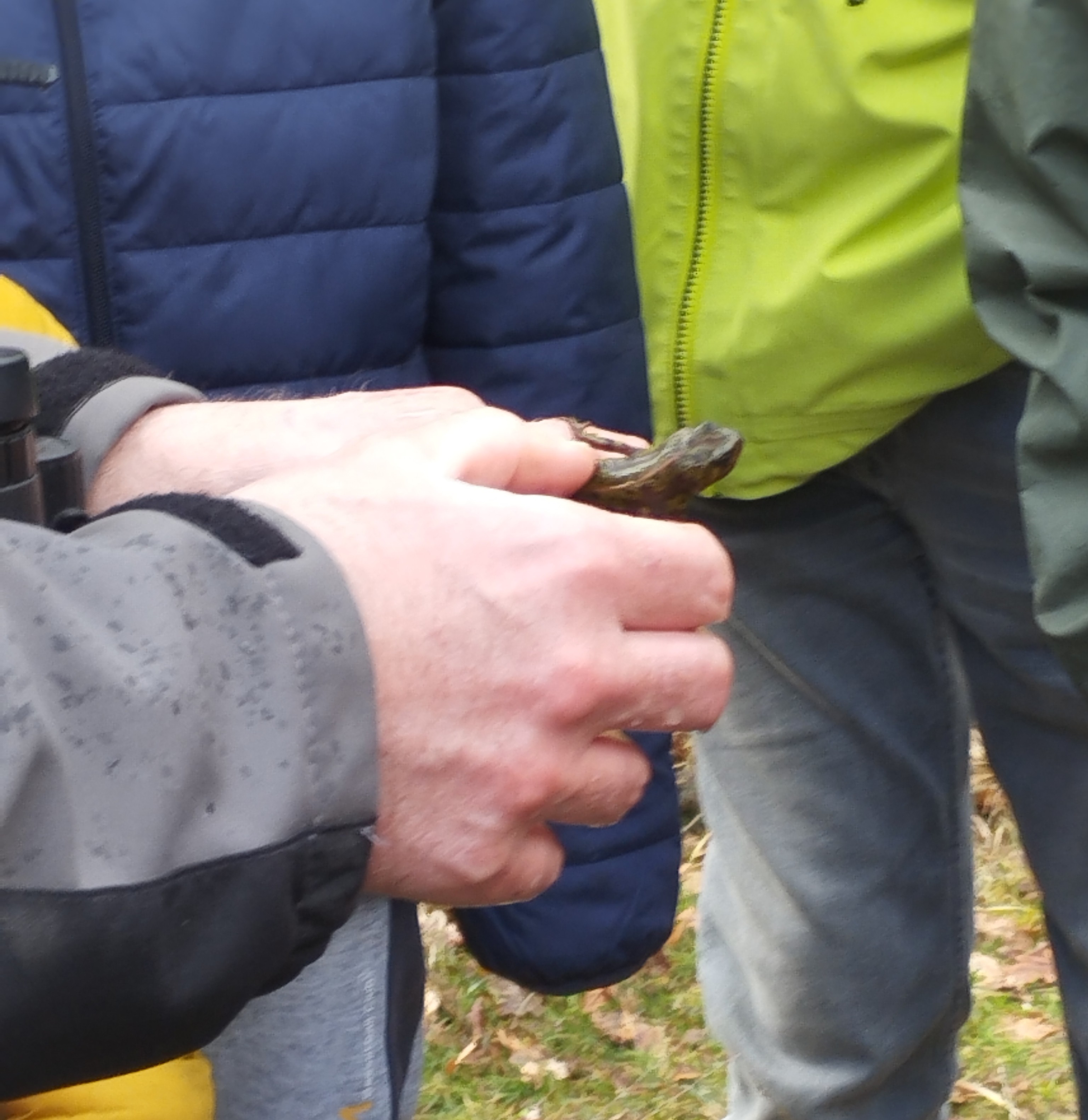 La balade se poursuit avec un focus sur les amphibiens qui peuplent le site. Le conservateur de la réserve a pour cela disposé des systèmes artisanaux de « nasses », qui permettent de collecter quelques spécimens. Il est habilité et autorisé pour faire ce type de prélèvement. Dans une première mare, David récupère ainsi un très joli triton marbré. L’animal fait partie de la famille des « urodèles », avec sa cousine la salamandre. « On le trouve surtout en milieu forestier », explique le conservateur, en le prenant délicatement dans sa main, pour que tout le groupe puisse observer au mieux. Il le relâche ensuite tout doucement, et le joli triton reprend le cours de son aventure en se faufilant et s’enfonçant au cœur de la végétation qui peuple le petit point d’eau. Dans une autre mare située à quelques minutes de marche, ce sont trois jeunes tritons palmés qui ont été recueillis. C’est l’espèce qui est la plus commune, et qui est la plus aquatique. Elle est de petite taille, et son ventre est jaunâtre. On peut trouver également le triton alpestre, qui est une espèce protégée. Il est reconnaissable à sa petite crête chez le mâle, en phase aquatique, et à son ventre orangé.