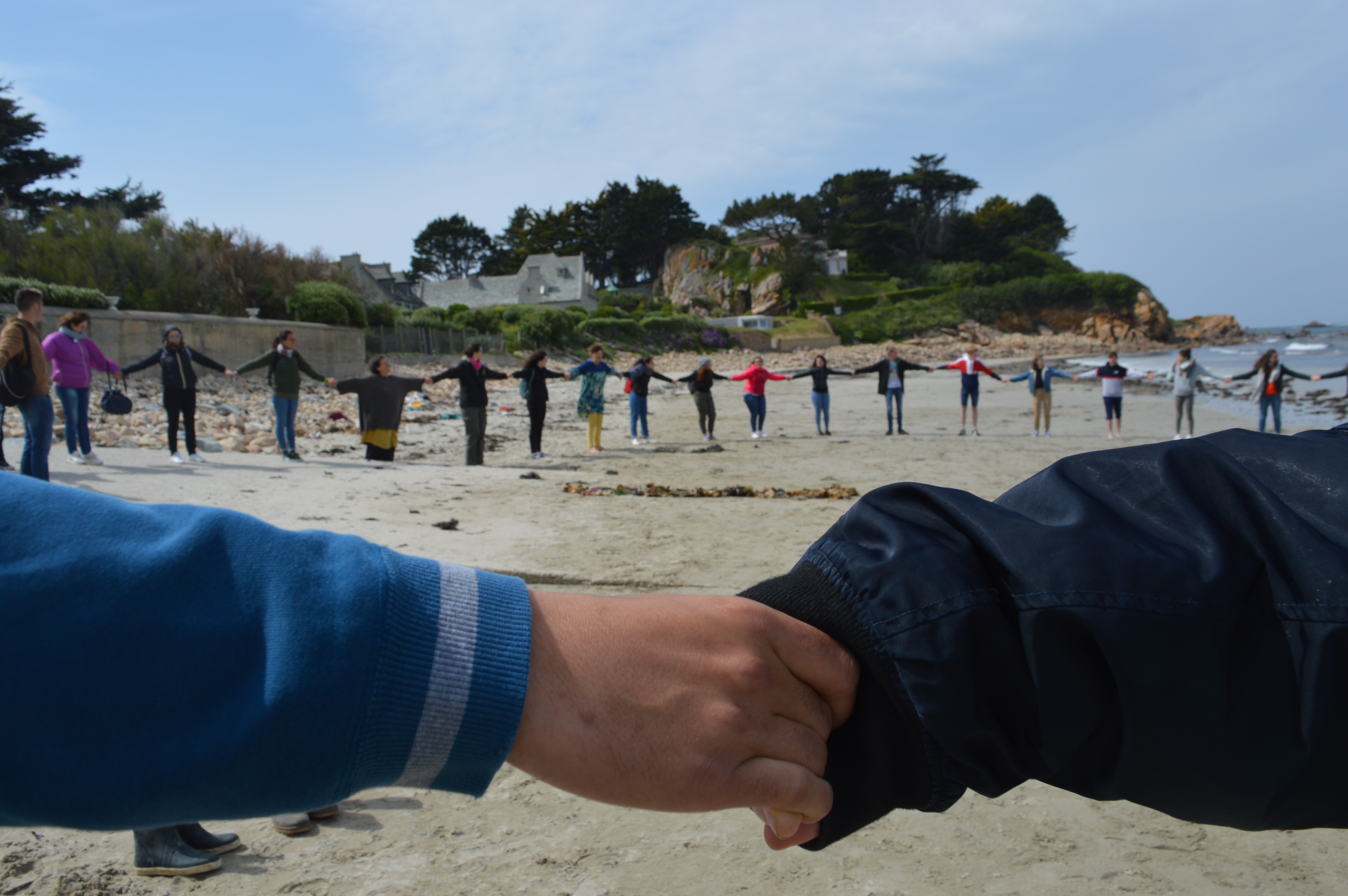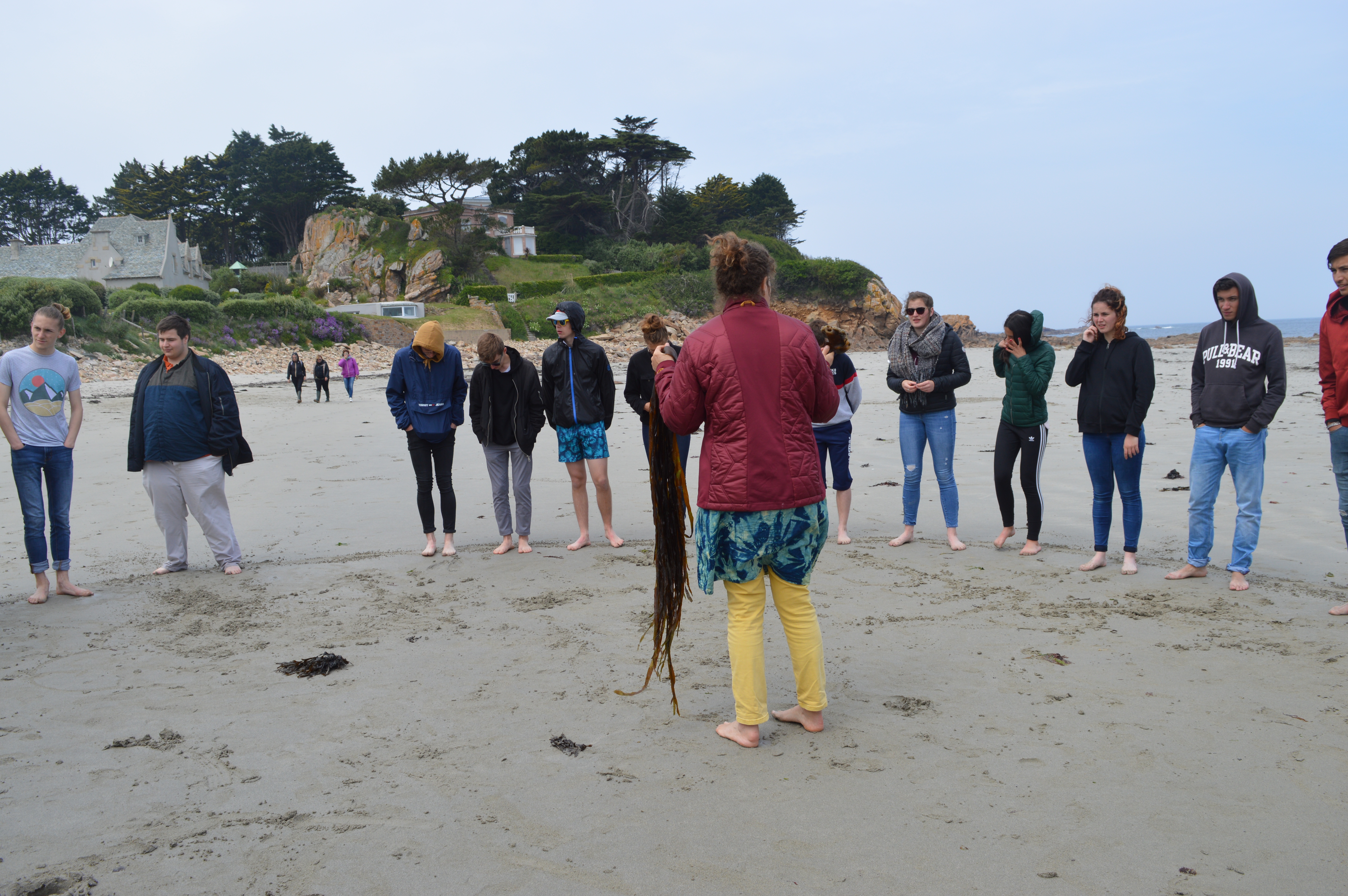 Ensuite, nous nous sommes réunis dans un premier cercle, où l’on a fermé nos yeux afin de pouvoir mieux nous connecter avec ce qui nous entoure. Dans le second cercle, la moitié du groupe s’est réincarnée en algues, et l’autre moitié jouait les courants marins afin de favoriser le lâcher-prise.
