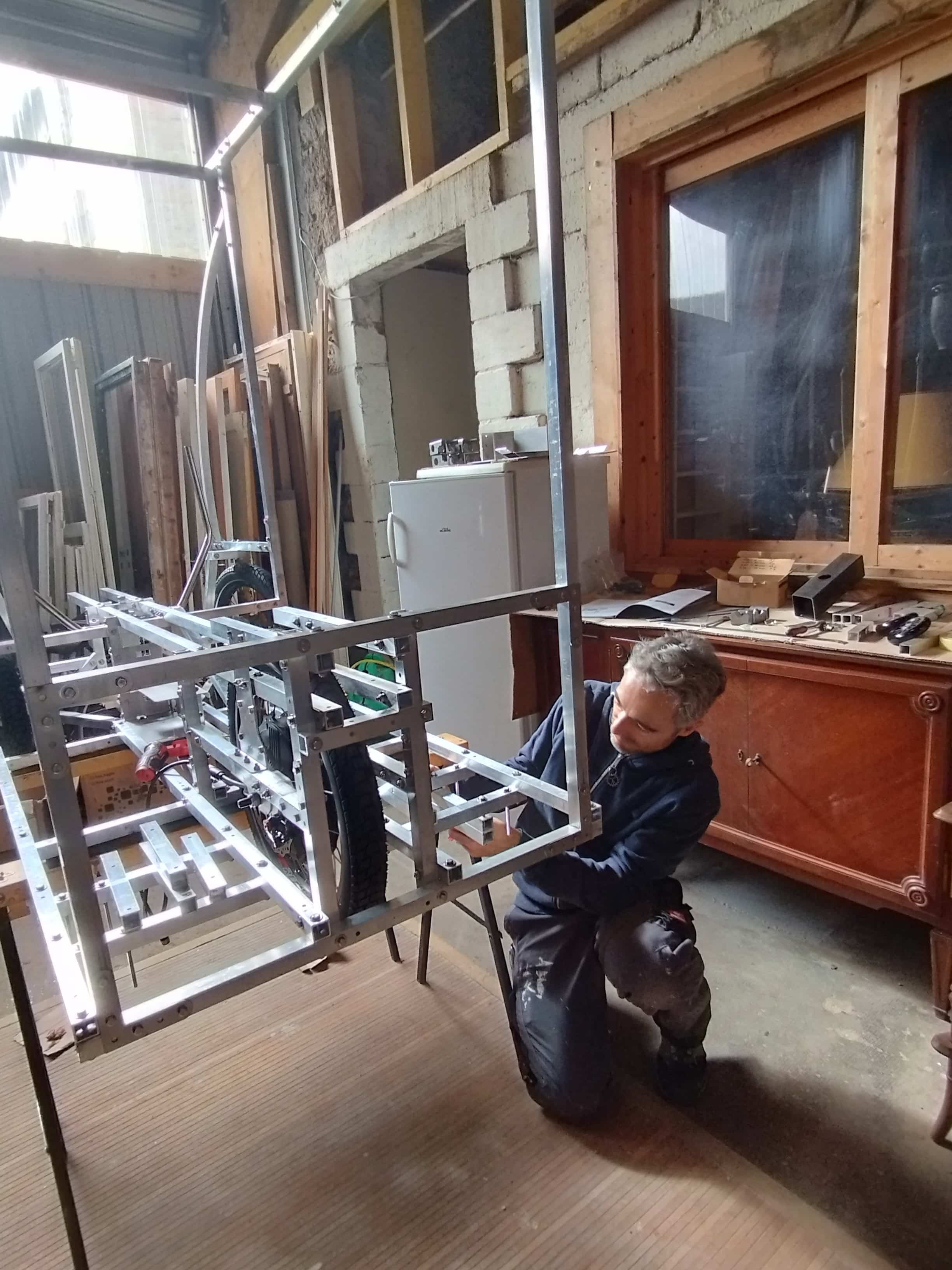 C’est sur ce dernier que s’est penchée une petite bande de bricoleuses et bricoleurs, à Pontivy. Catherine, Adrien, Gaëtan, Julien et Marie-Ange, accompagné.e.s d’autres participant.e.s de passage, se sont donnés rendez-vous dans un grand hangar. Ensemble, ils ont passés une semaine à monter deux « Vhélio’tech », grâce notamment à toute la documentation fournie gratuitement sur internet par l’association « Vélo solaire pour tous ». Celle-ci développe ce projet qui se veut collaboratif et open source, dans l’esprit des low techs. « L’idée, c’est que chacun.e puisse, n’importe où dans le monde, construire son Vhélio, sans outillage spécifique », expliquent Adrien et Gaëtan, qui sont membre de l’association. « C’est un peu comme si on jouait aux Mecanos ! C’est assez simple pour qu’un enfant de 14 ans puisse le faire ». « En plus, faire le montage, ça donne confiance en soi », fait remarquer Catherine.