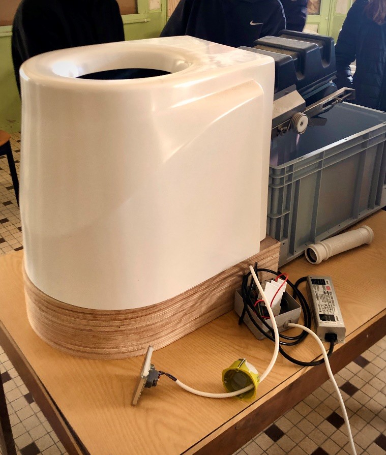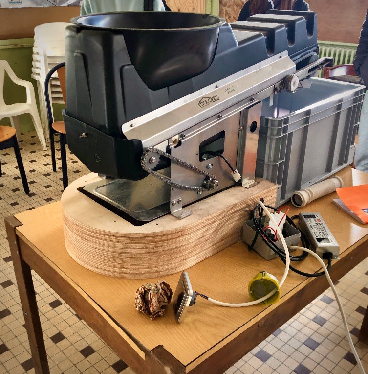 Le système retenu est celui développé par l’entreprise Ecodemeo. C’est un système avec séparateur fonctionnant donc sans eau et sans sciure. Un tapis roulant entraîne les matières fécales vers un bac de collecte situé à l’arrière des toilettes. L’urine, quant à elle, coule par gravité vers l’avant du tapis pour ensuite descendre dans trois cuves de 5m3 enterrées dans le jardin. Ainsi, l’urine et les matières fécales peuvent être traitées distinctivement. Afin d’en faciliter l’usage, le tapis roulant fonctionne grâce à un moteur électrique de 12 volts, le même moteur que celui utilisé pour les essuie-glaces d’une voiture. Ce fonctionnement rappelle le principe de la chasse d’eau : en appuyant sur un bouton les excréments disparaissent. La VMC des habitations est connectée au bac de collecte situé à l’arrière des toilettes afin d’aspirer les mauvaises odeurs et d’assécher les matières fécales. Ce bac a d’ailleurs été pensé pour éviter les manipulations inutiles, pour préserver l’intimité de chacun grâce à son couvercle et aussi pour sécuriser le travail de collecte du maître composteur (poids du bac, pénibilité, risques professionnels…). Il permet de recueillir les matières fécales d’un foyer de quatre personnes générées sur un mois. Le maître composteur de l’association Compost’tout, récolte donc le contenu des bacs 1 fois par mois. En évitant l’ajout de sciure, ce système facilite le travail du maître composteur et réduit les contraintes et les manipulations pour les usagers.